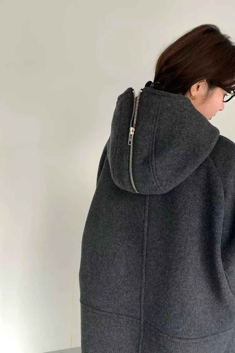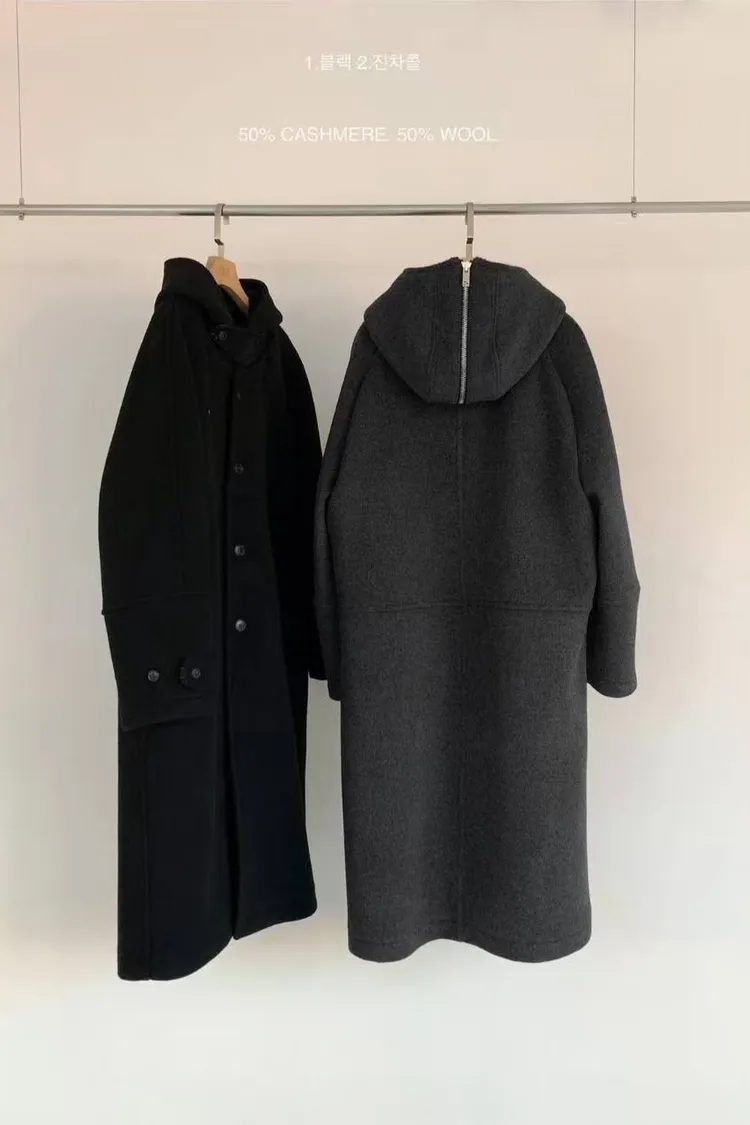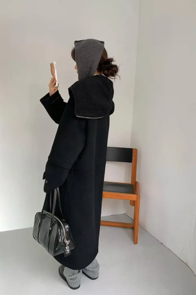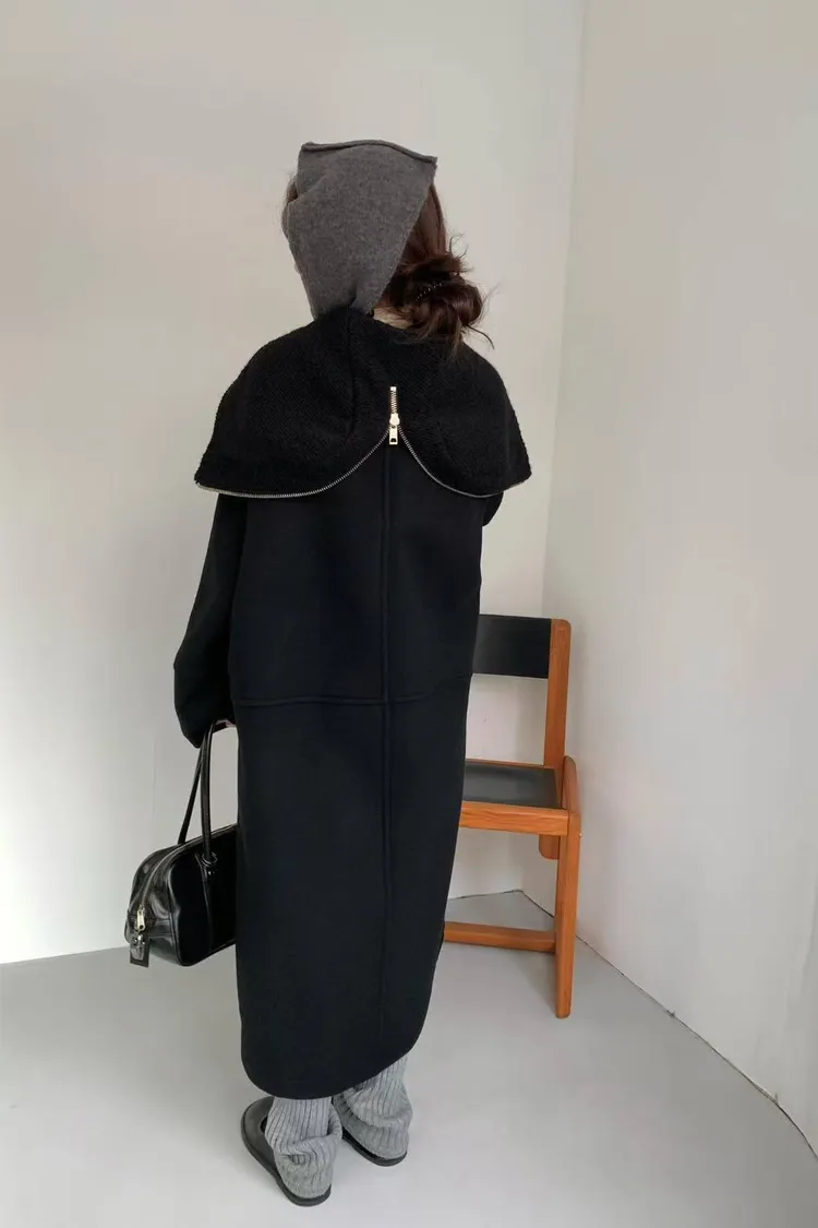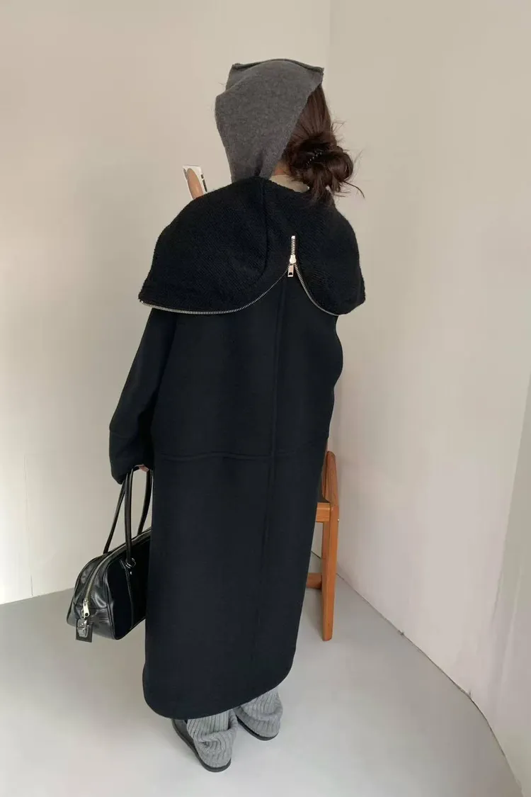 韓國連線款 設計感帽子披肩羊毛大衣外套 長版大衣外套