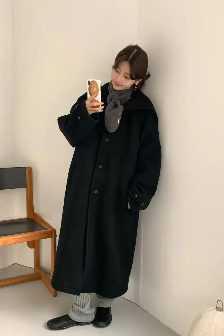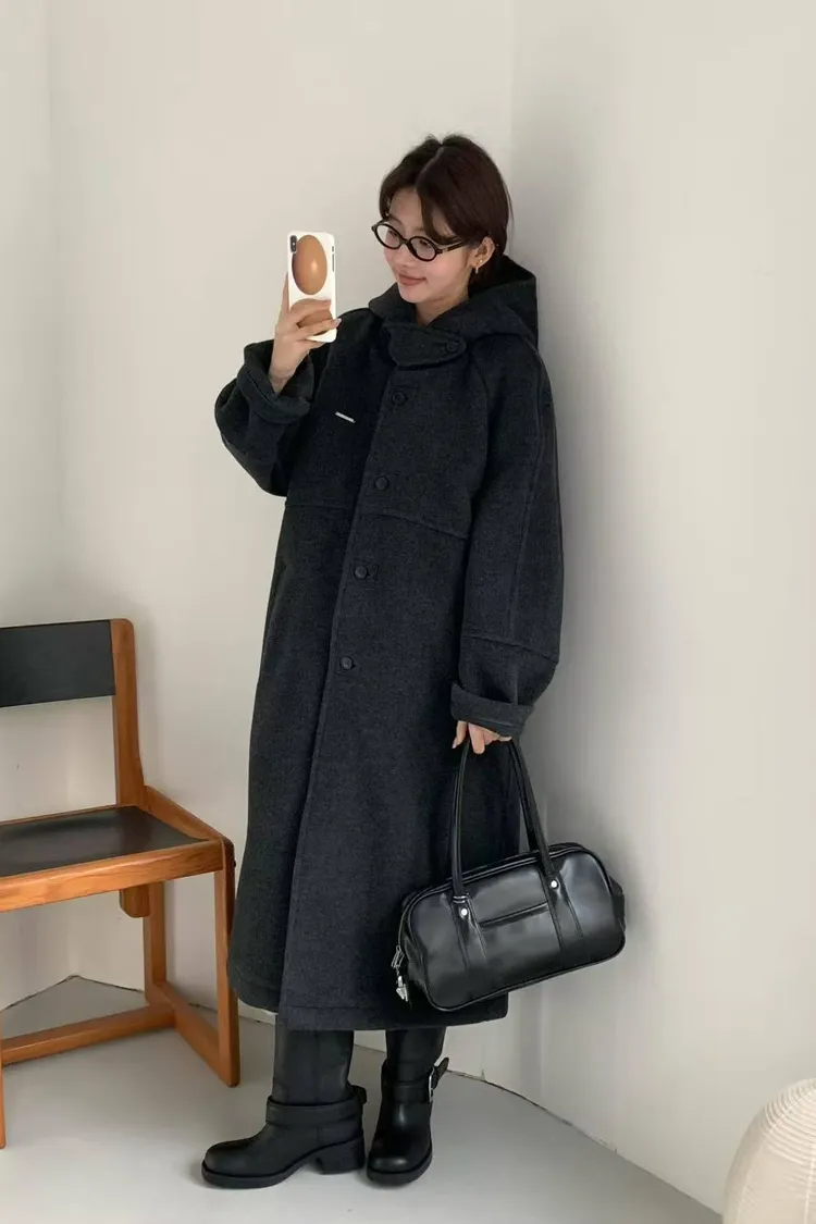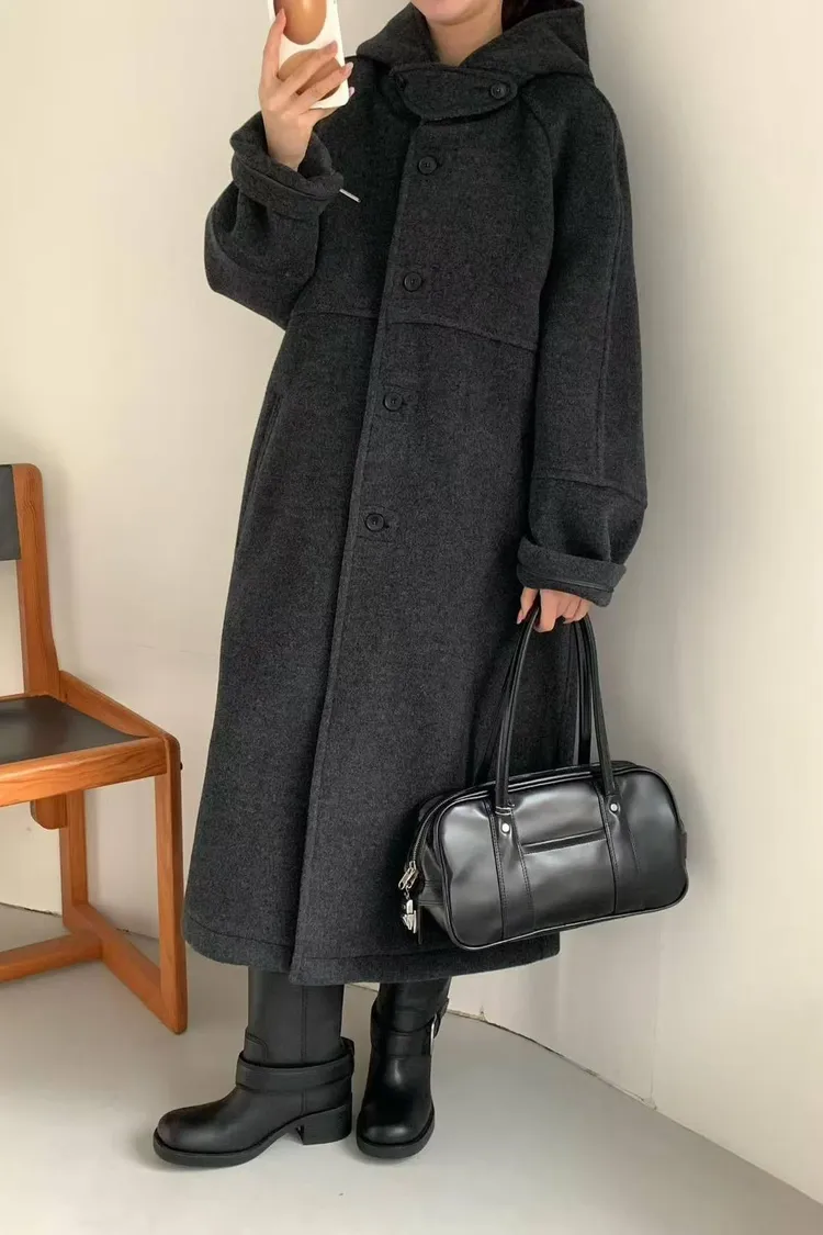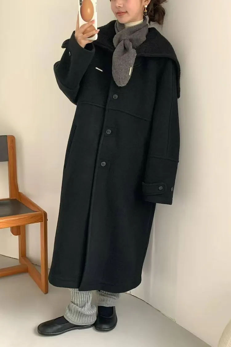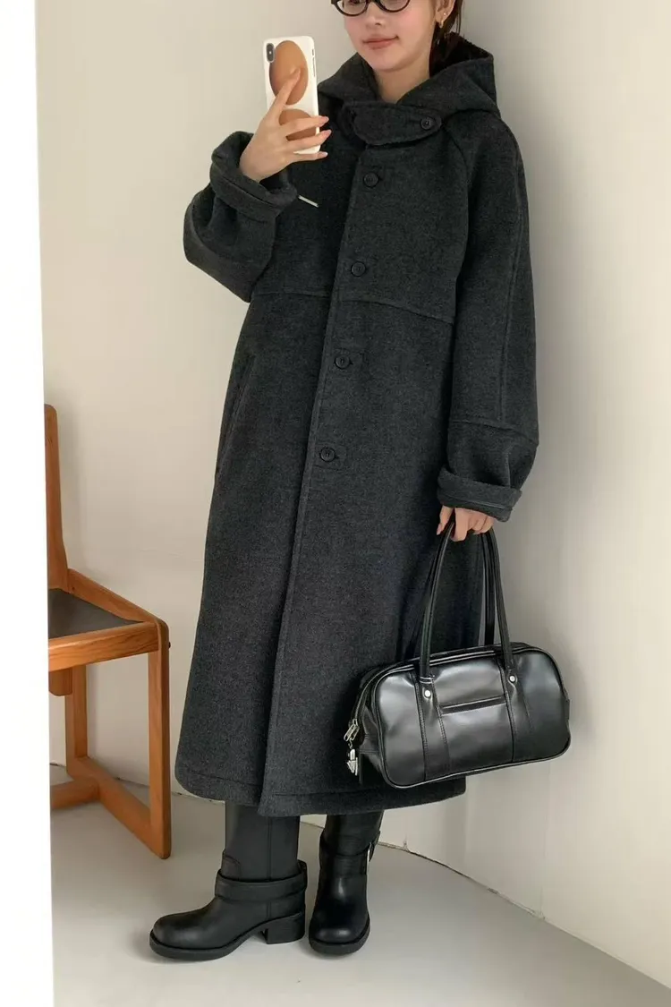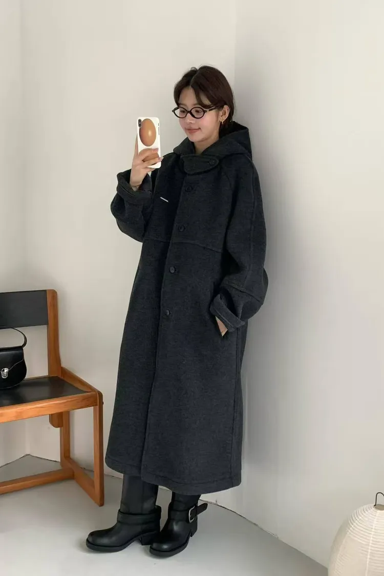 韓國連線款 設計感帽子披肩羊毛大衣外套 長版大衣外套
