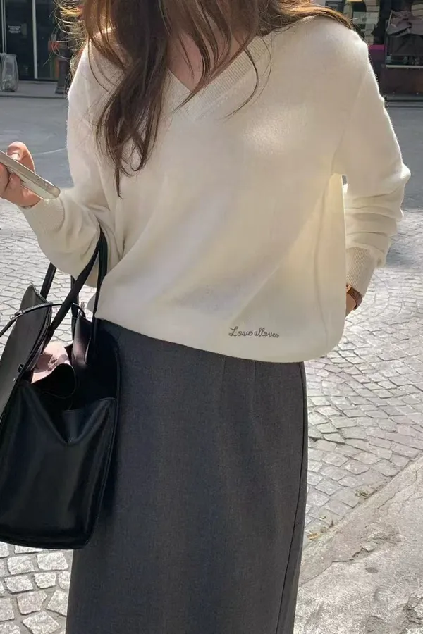 刺繡V領羊毛針織上衣 字母刺繡毛衣