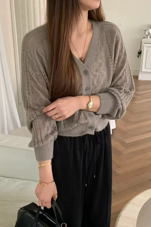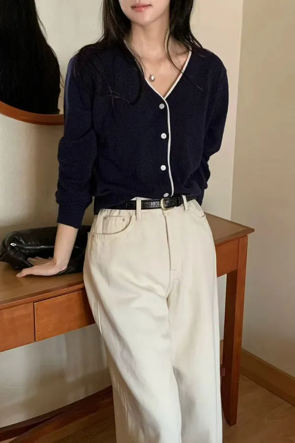 氣質滾邊V領針織上衣 氣質極簡開衫外套