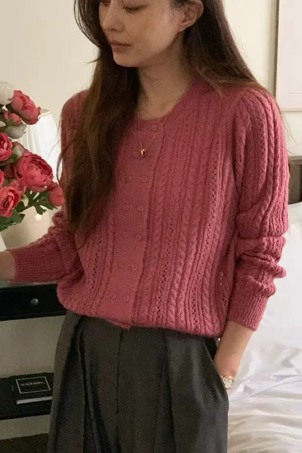 斜扣V領麻花針織上衣 V領交叉針織上衣