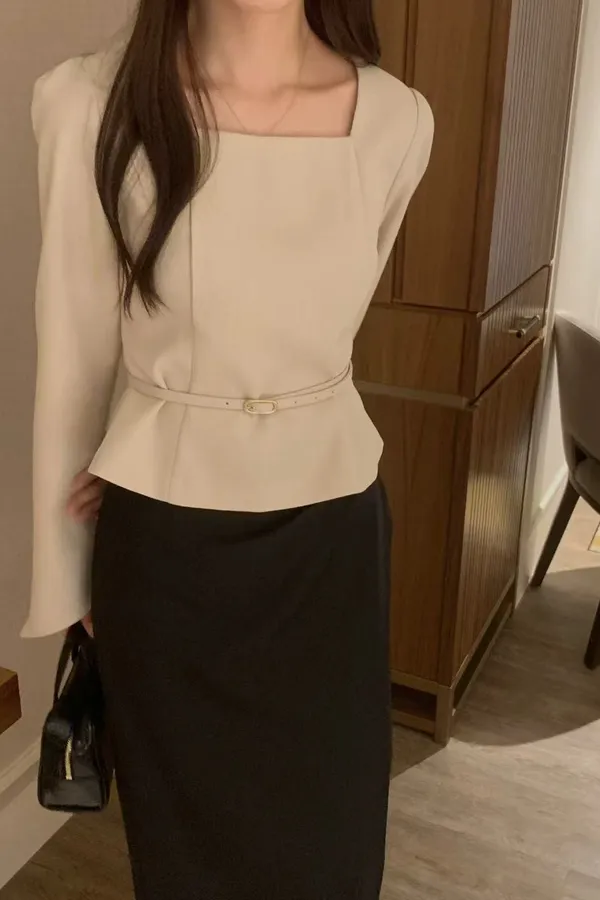 方領修身腰帶設計上衣 顯瘦氣質通勤上衣