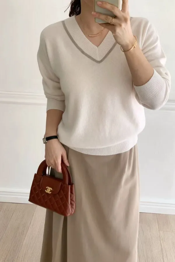 超美輕盈不刺 羊駝毛假兩件V領針織上衣 雙色拼袖針織毛衣