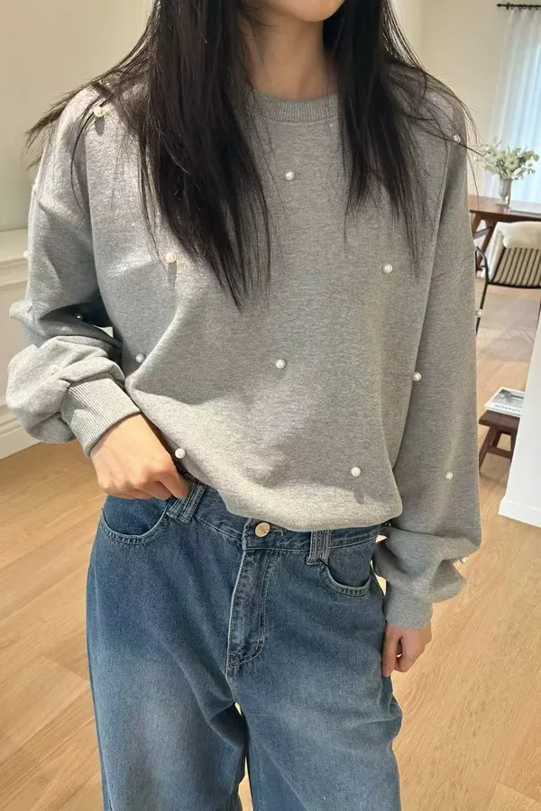 珍珠點綴棉質長袖上衣 圓領寬鬆大學T