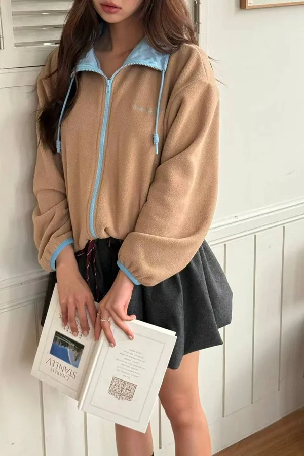 拼色羊羔絨高領外套 保暖休閒寬鬆上衣