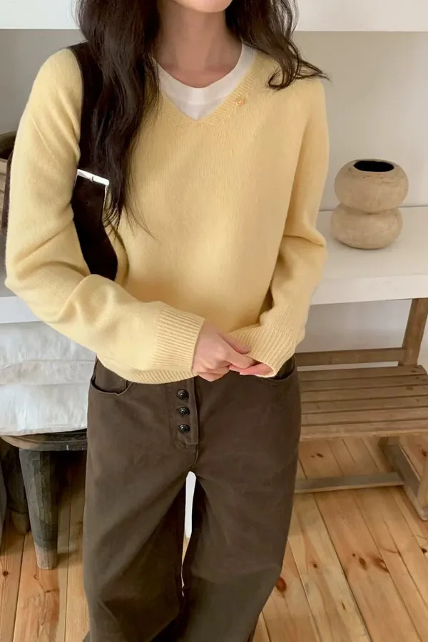 ONE MONE 15色金屬小標 100%純羊毛 V領針織長袖上衣