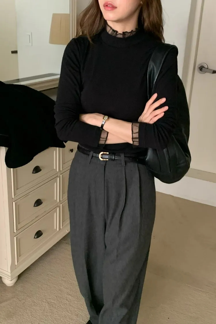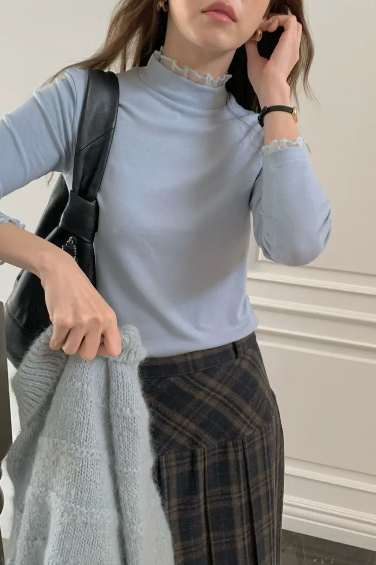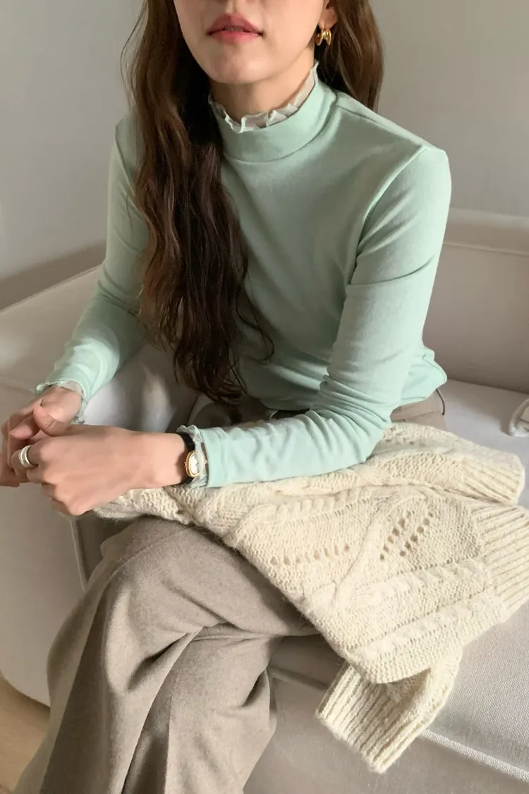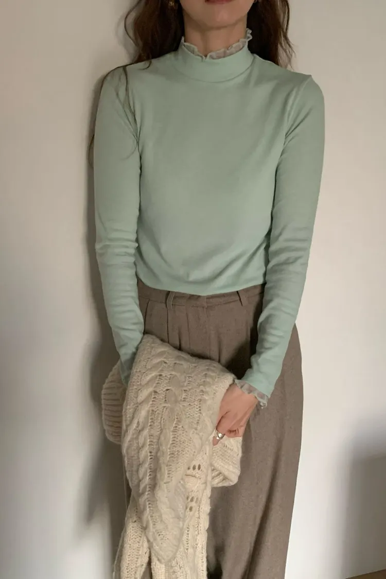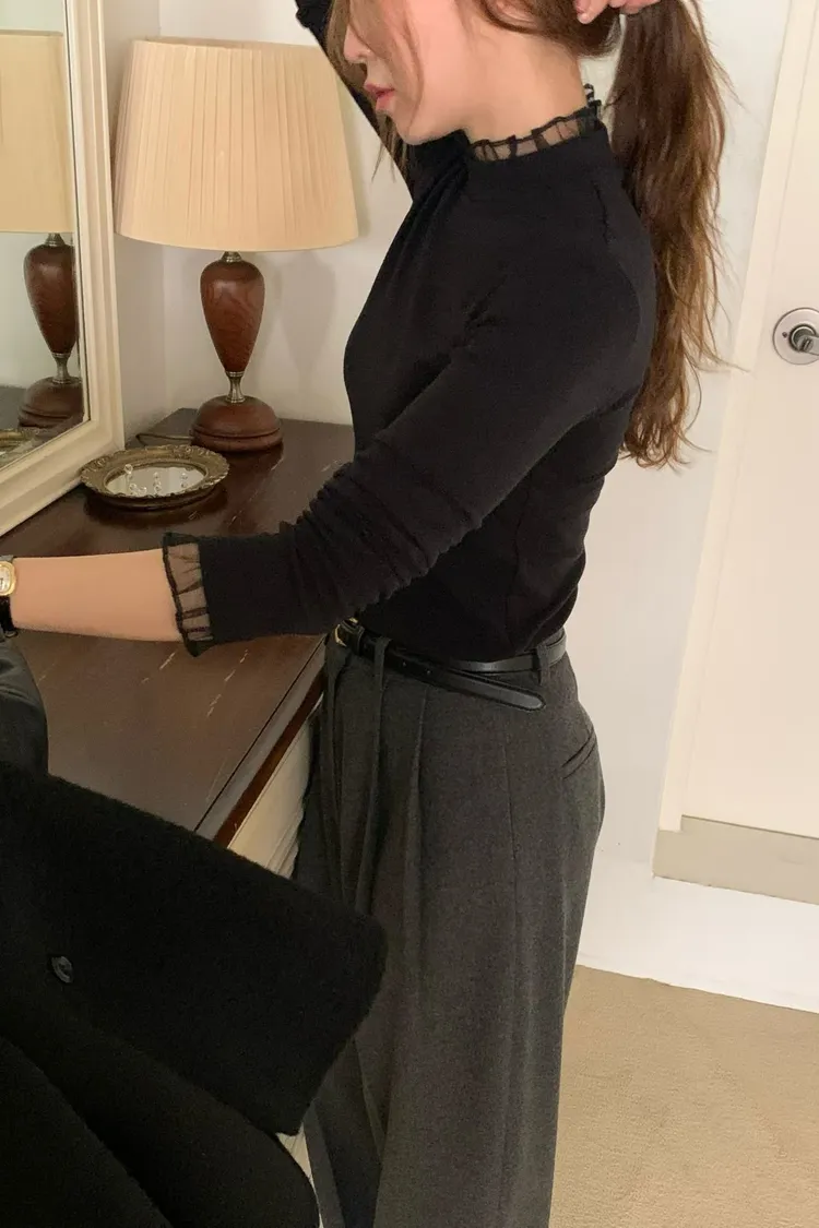 正韓秋冬單品內搭推薦 莫代爾彈力 蕾絲拼接百搭上衣 打底衫