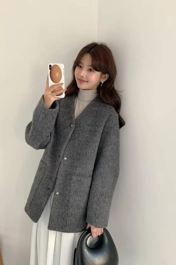 韓國代購 egg 雞蛋家 羊絨羊毛v領大衣外套 短版大衣外套