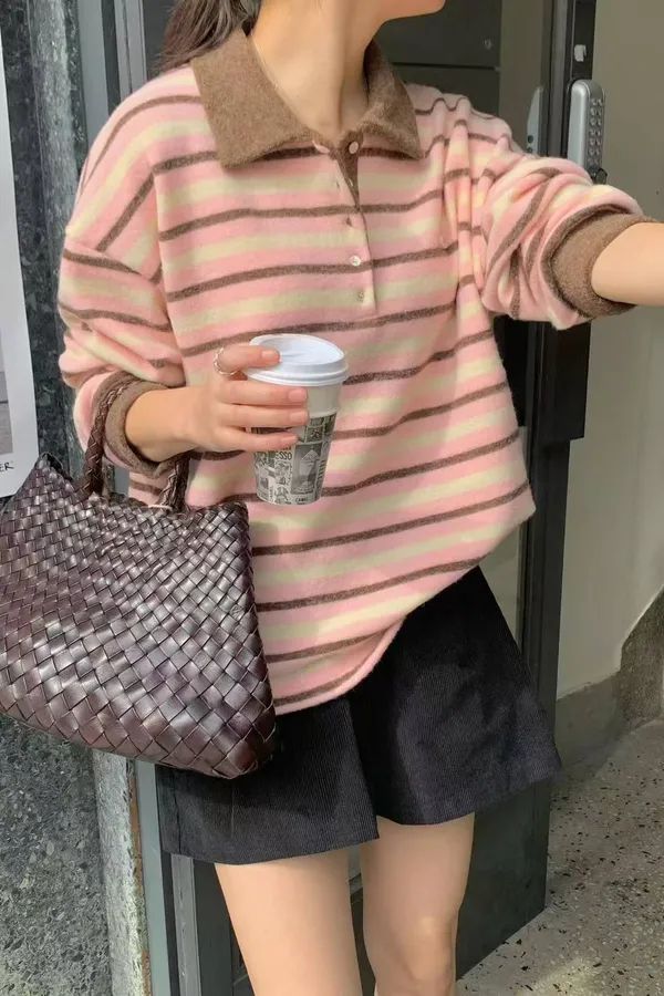 韓國代購 爆款 內刷毛條紋衫 POLO翻領條紋上衣
