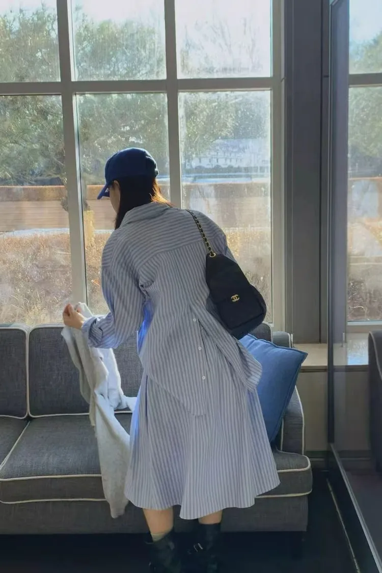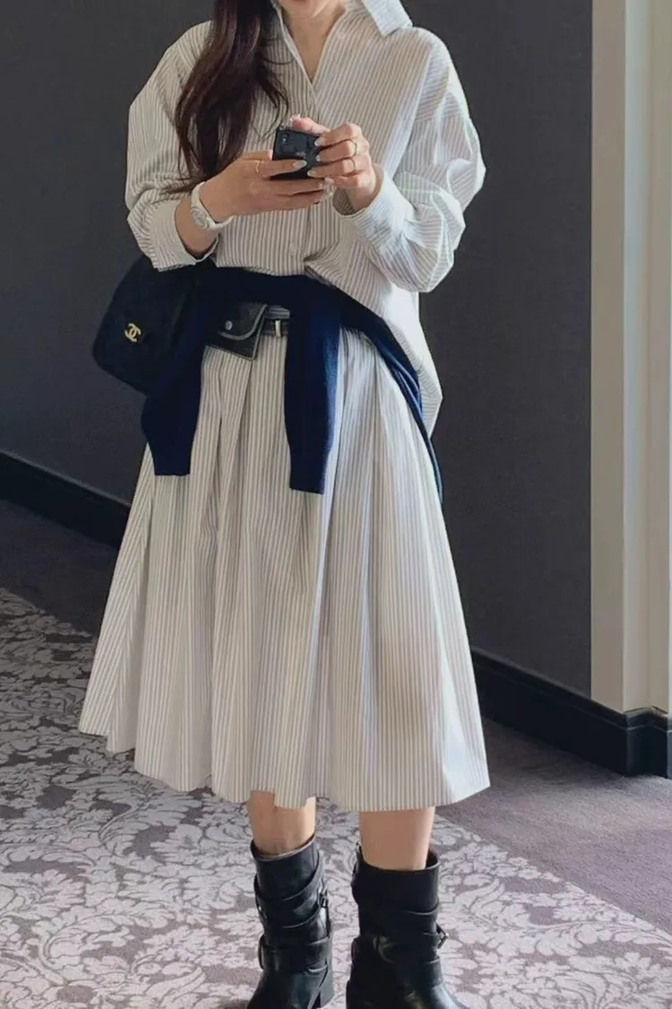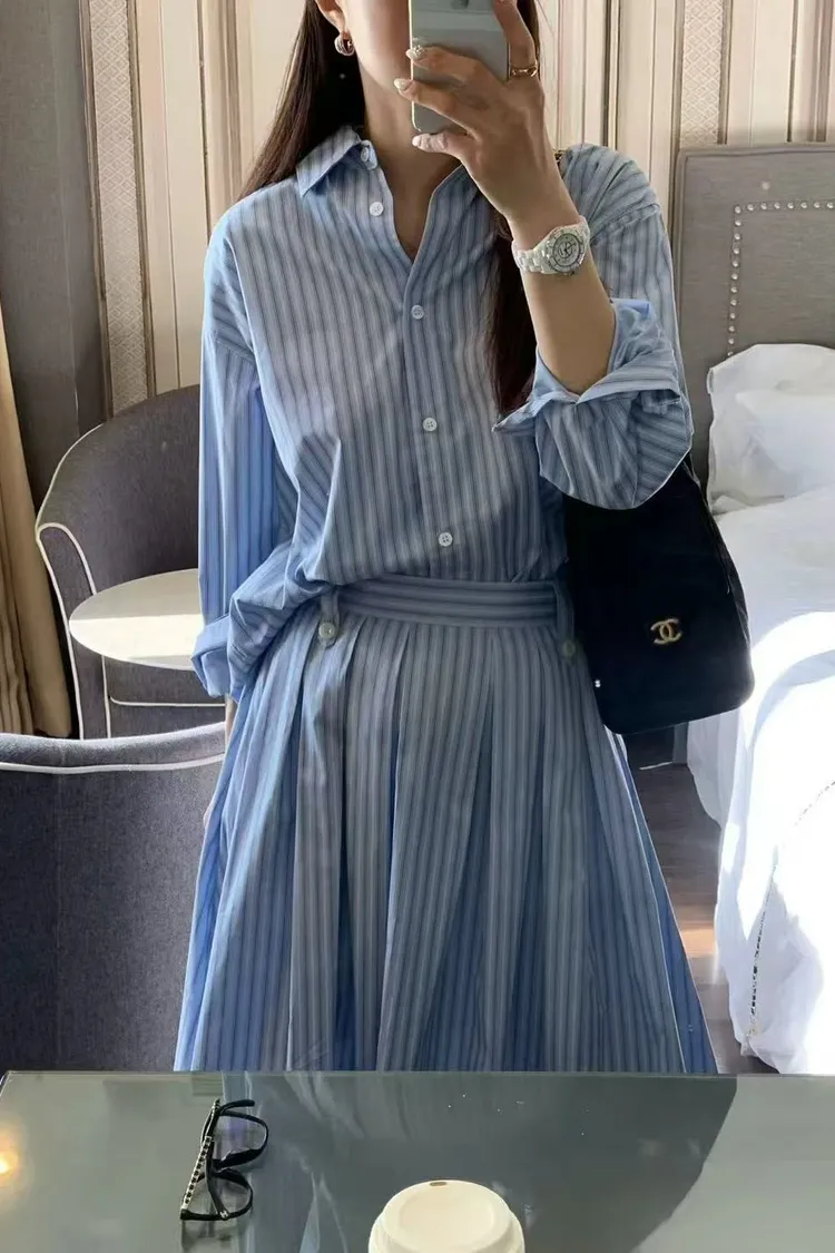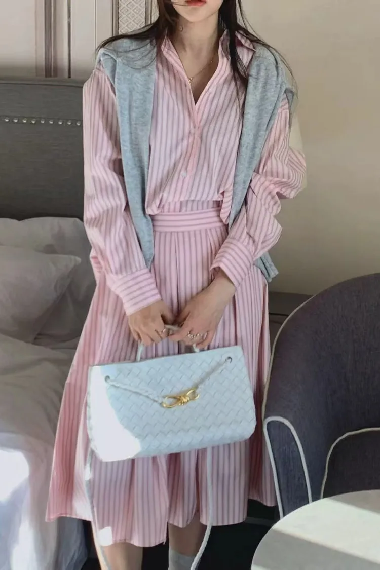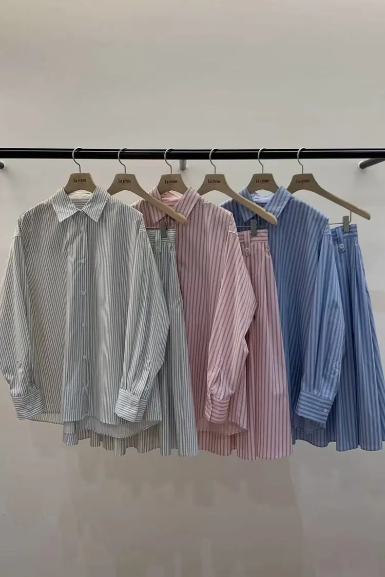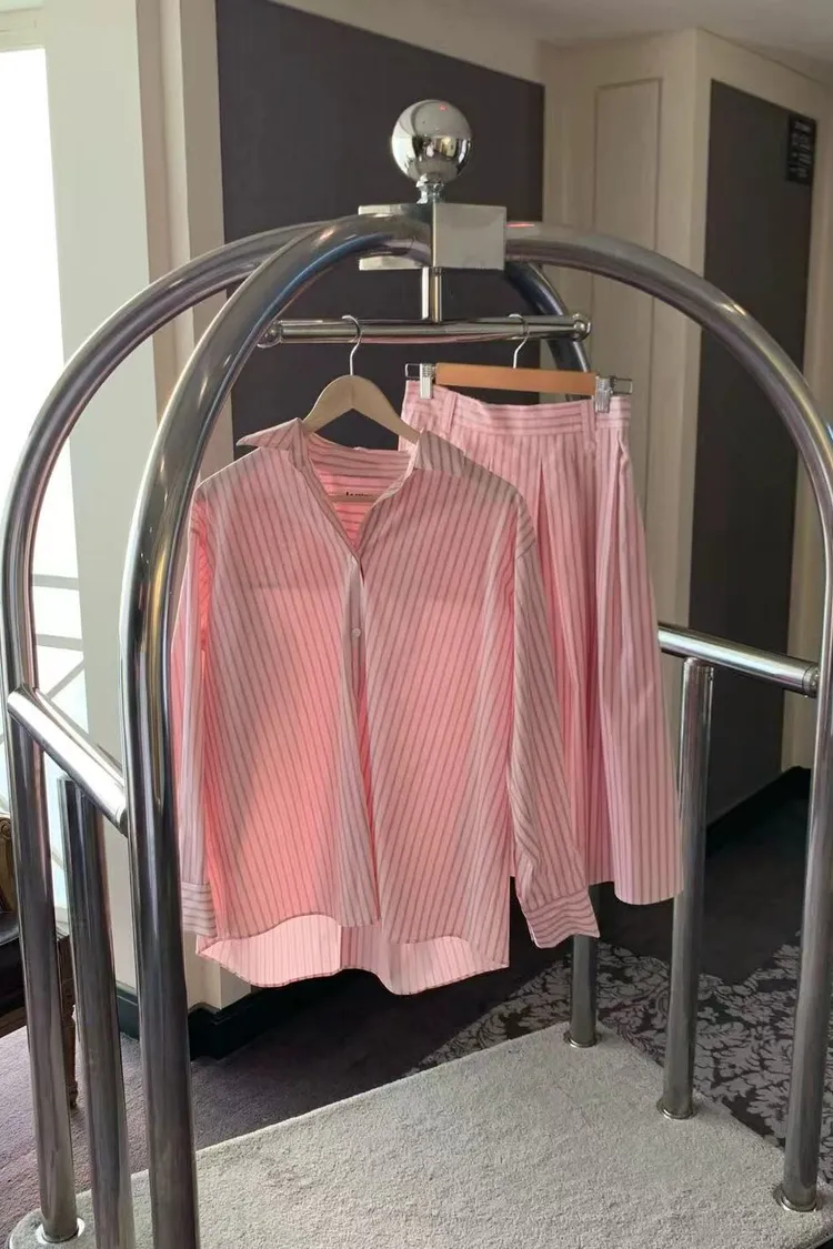 正韓女裝 撞色直條紋寬鬆後鬆緊打褶套裝