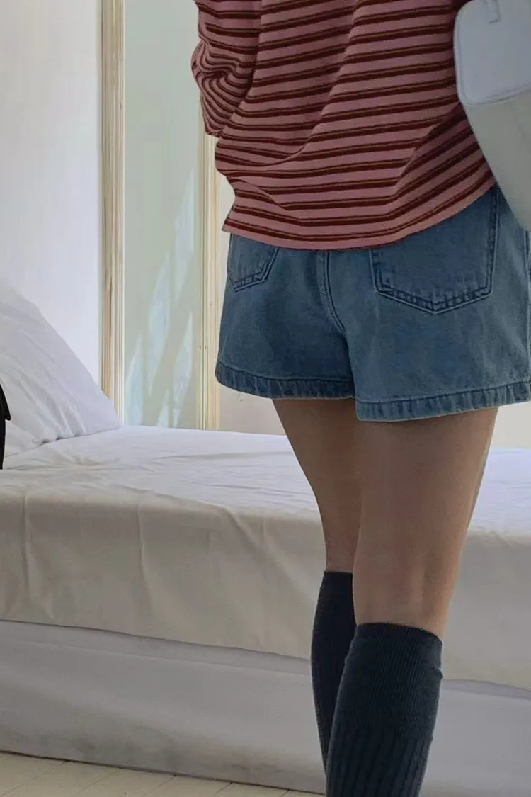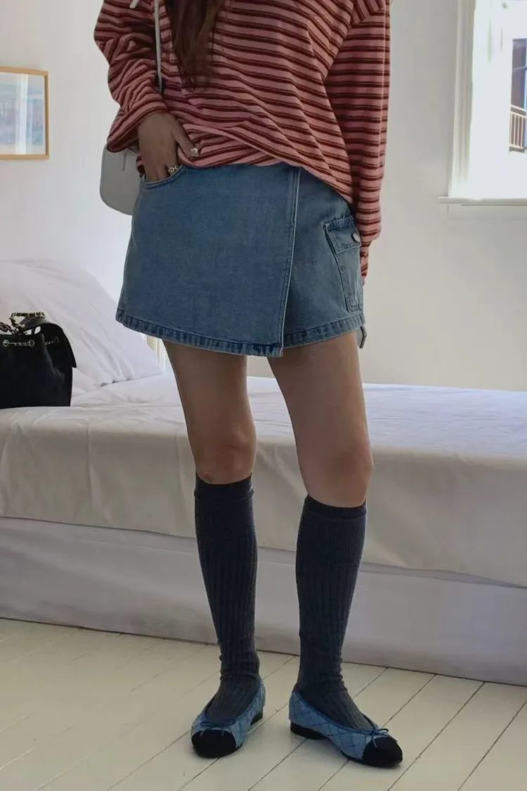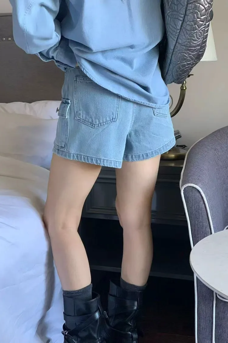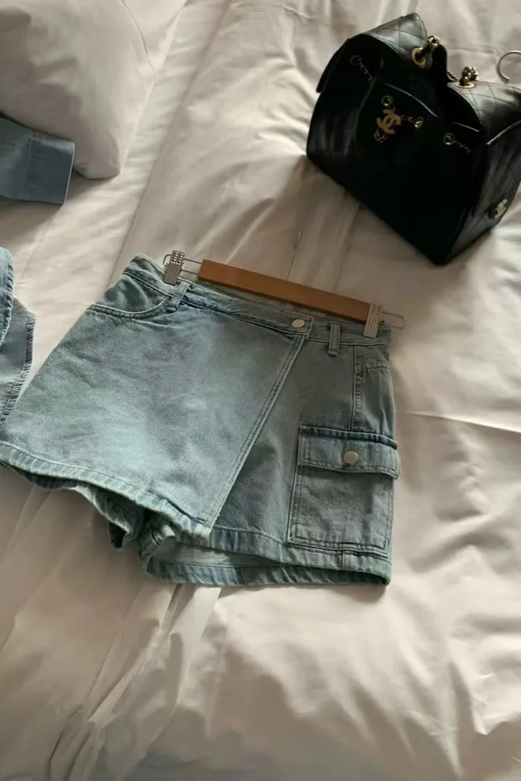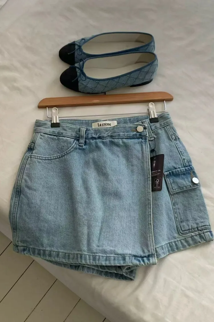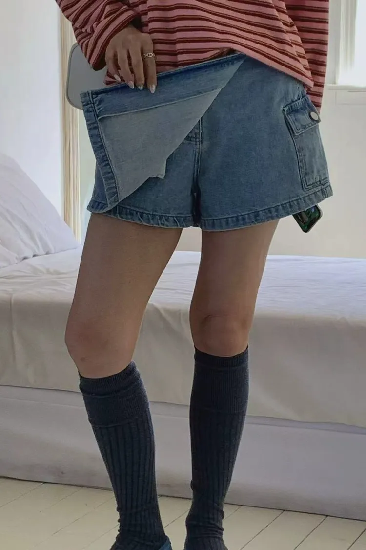 正韓女裝 水洗工裝口袋牛仔褲裙 休閒顯瘦A字短裙