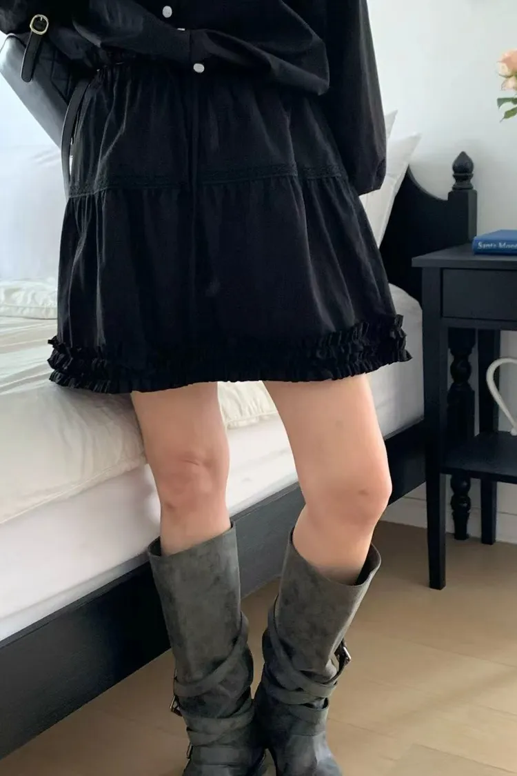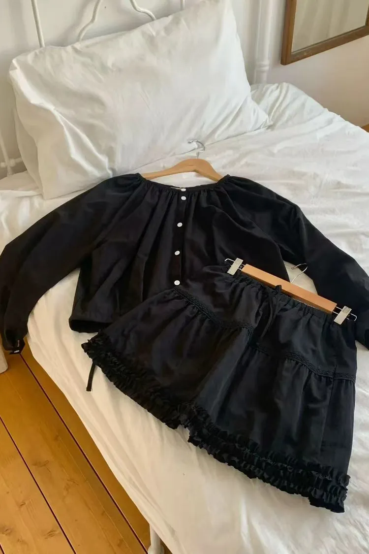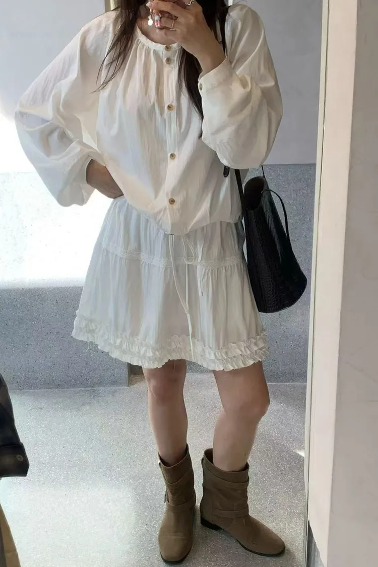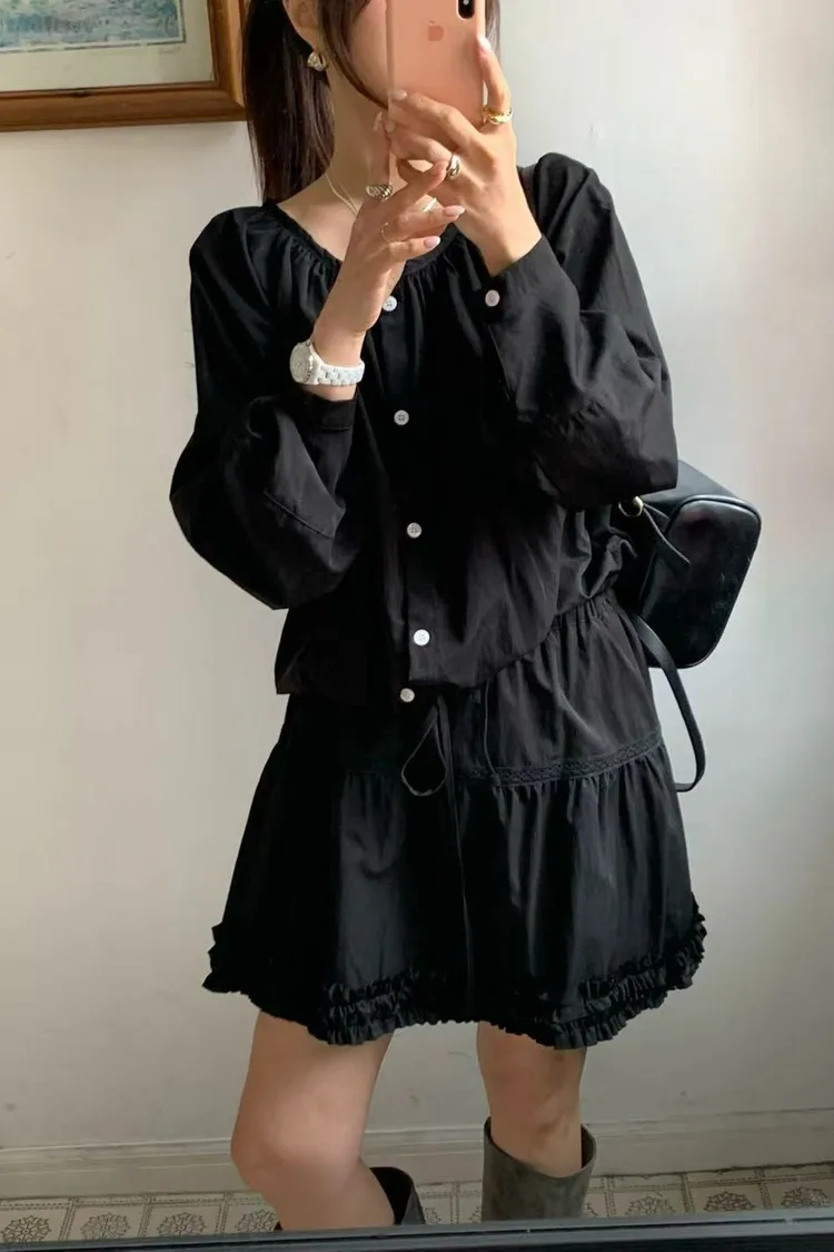 正韓女裝 簡約設計感圓領抽皺襯衫套裝 荷葉邊抽繩蕾絲拼接短裙套裝