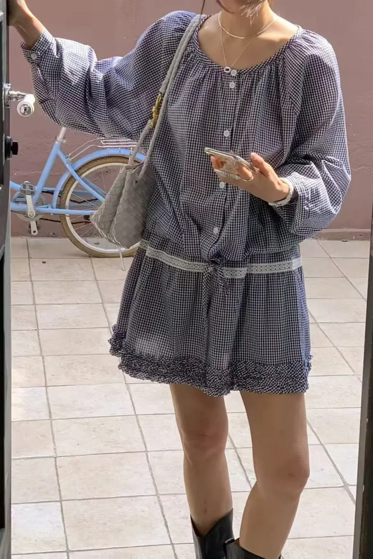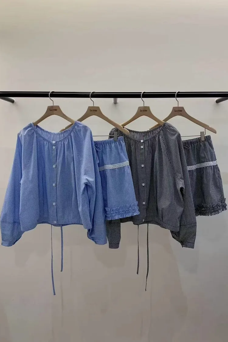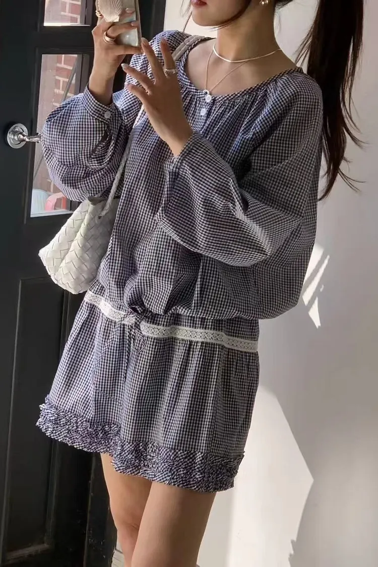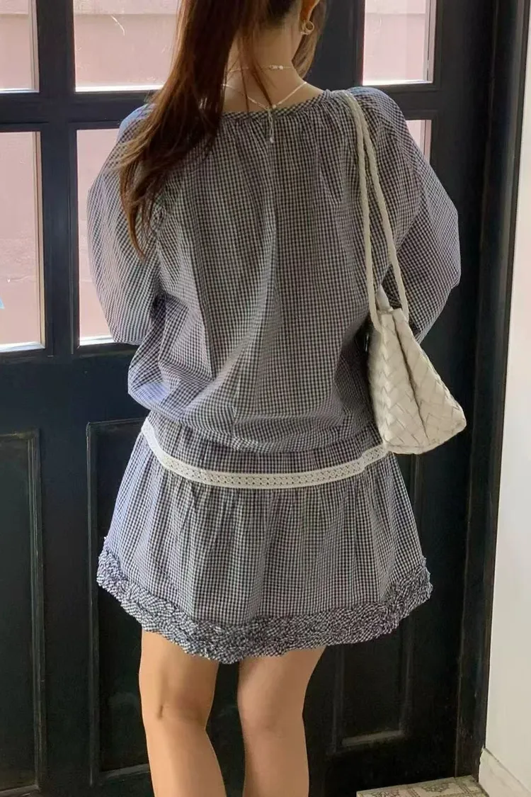 正韓女裝 簡約設計感圓領抽皺襯衫套裝 荷葉邊抽繩蕾絲拼接短裙套裝