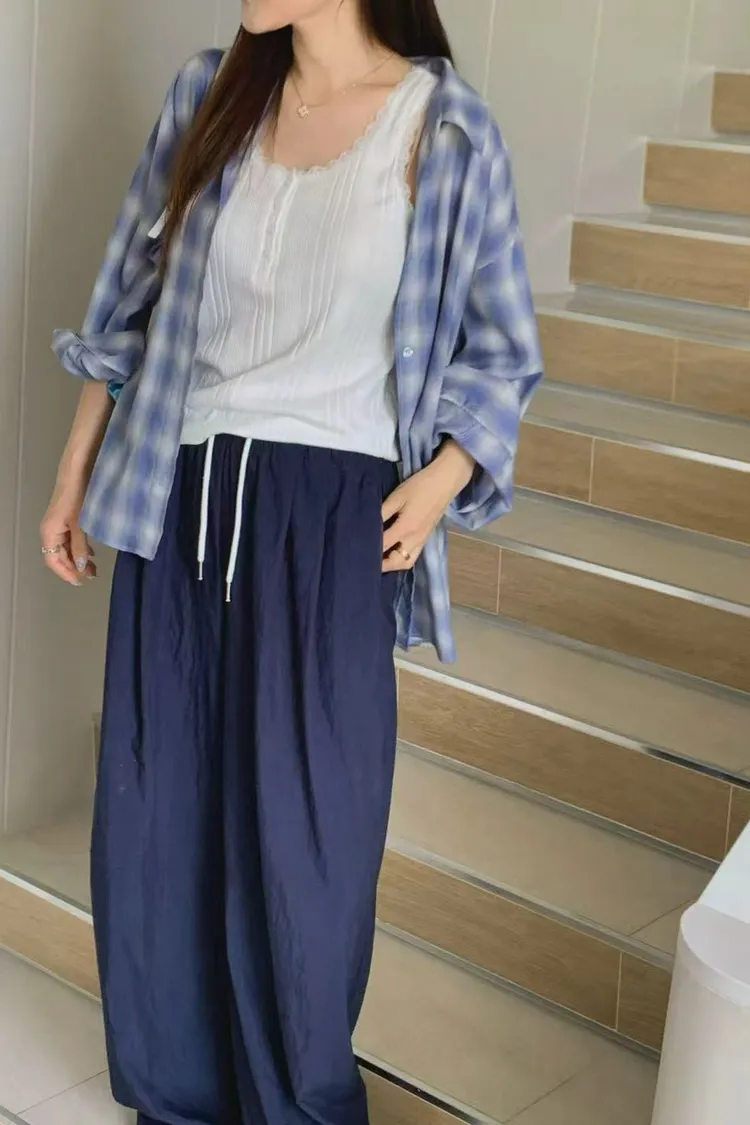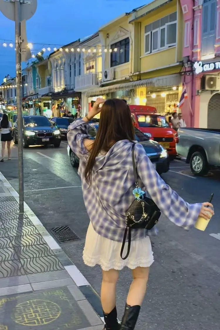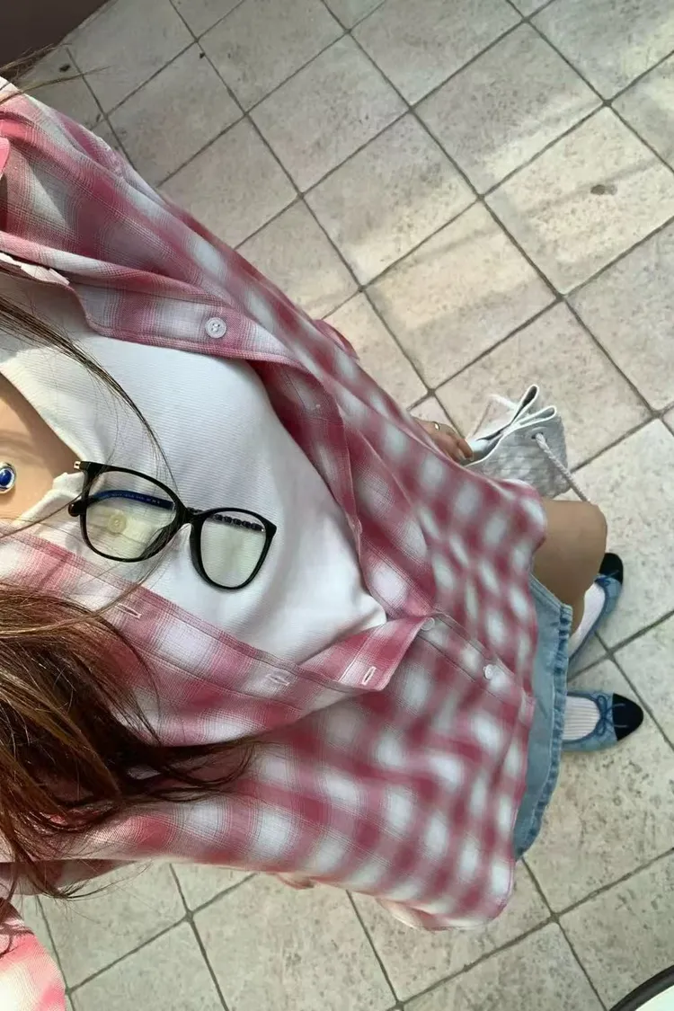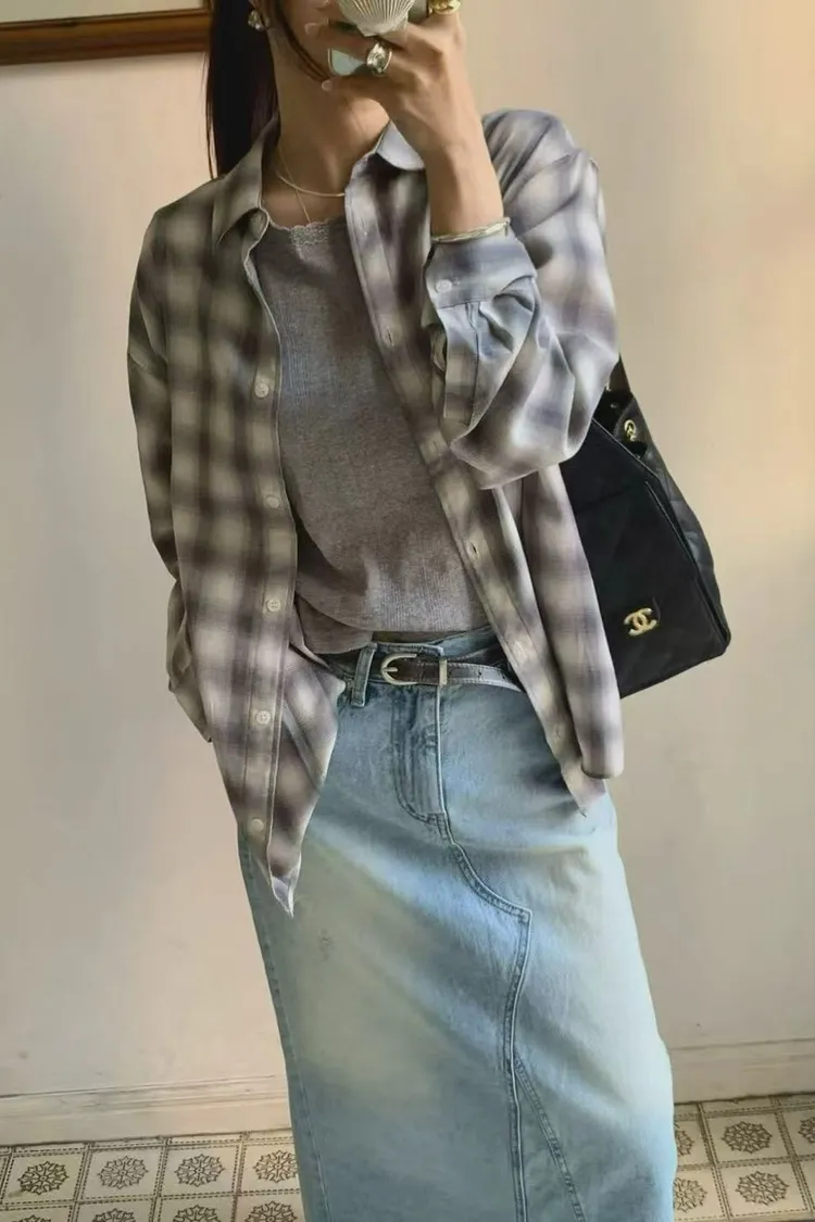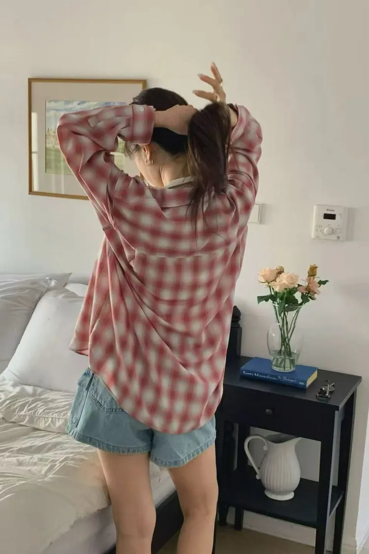 正韓女裝 復古格紋寬鬆長袖 親膚透氣外搭